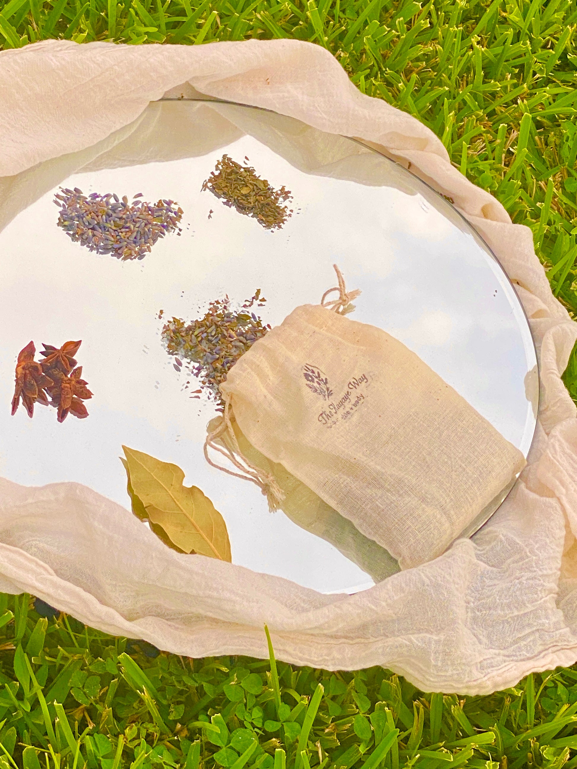Eco-friendly muslin sachets, individually wrapped or bundled in collections.