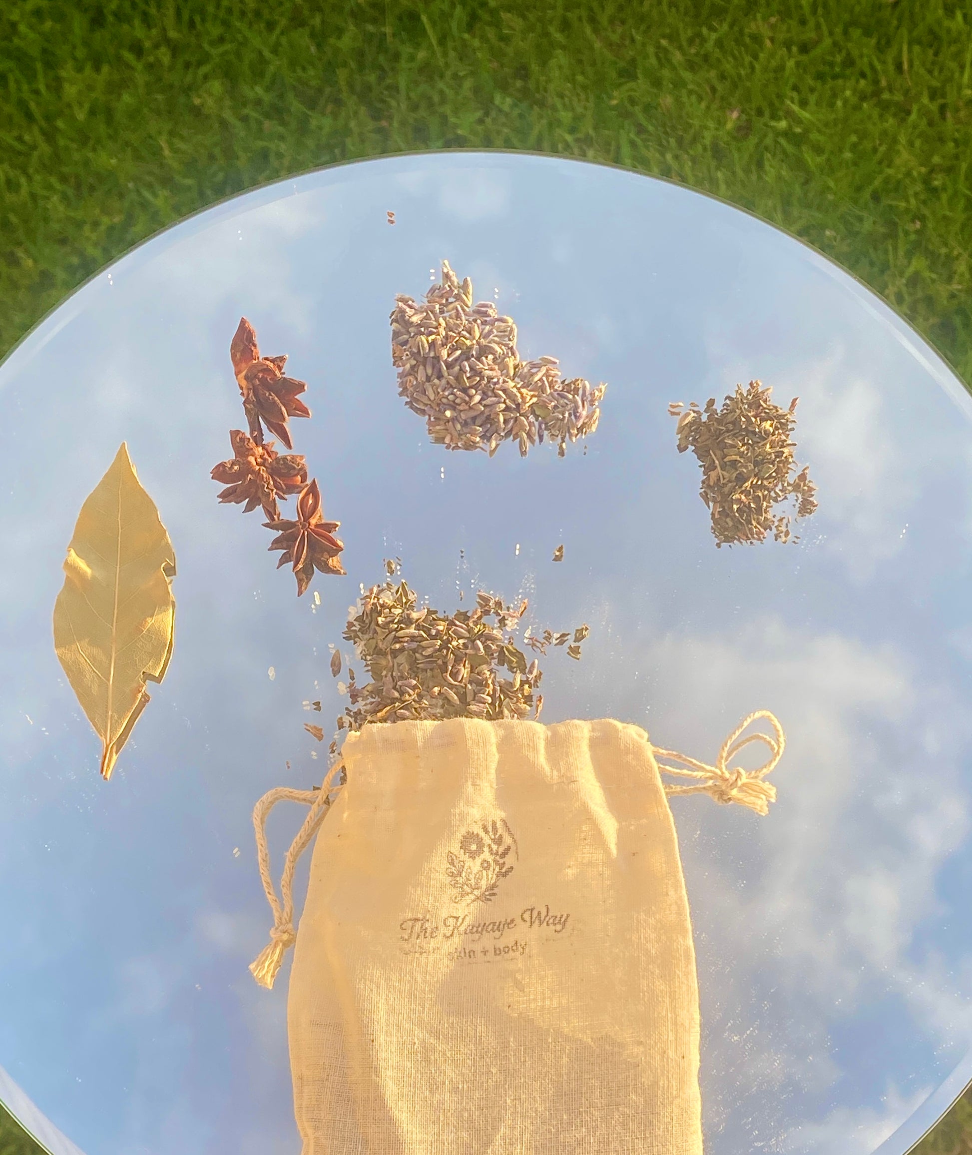 Nyaamato, “Rebirth,” is a bath ritual for spiritual and energetic reset. Bay leaves, peppermint, lavender, and star anise sweep away stagnation, while lemon and sandalwood oils uplift and ground. This soak purifies the aura and restores lightness — preparing you for new beginnings.